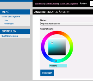 Über die Rubrik „Status Angebote“ gelangen Sie zu der obigen Liste. Dort können Sie die Farben durch Anklicken der Farbpunkte auswählen und über die Skala Ihren gewünschten Ton einstellen. Hier können Sie auch die Bezeichnung ändern oder links im Menü einen Status hinzufügen. Jedoch sollten Sie beachten, dass zu viele Kurven auch verwirren können, weshalb nur die für Sie interessantesten eingeblendet werden sollten.