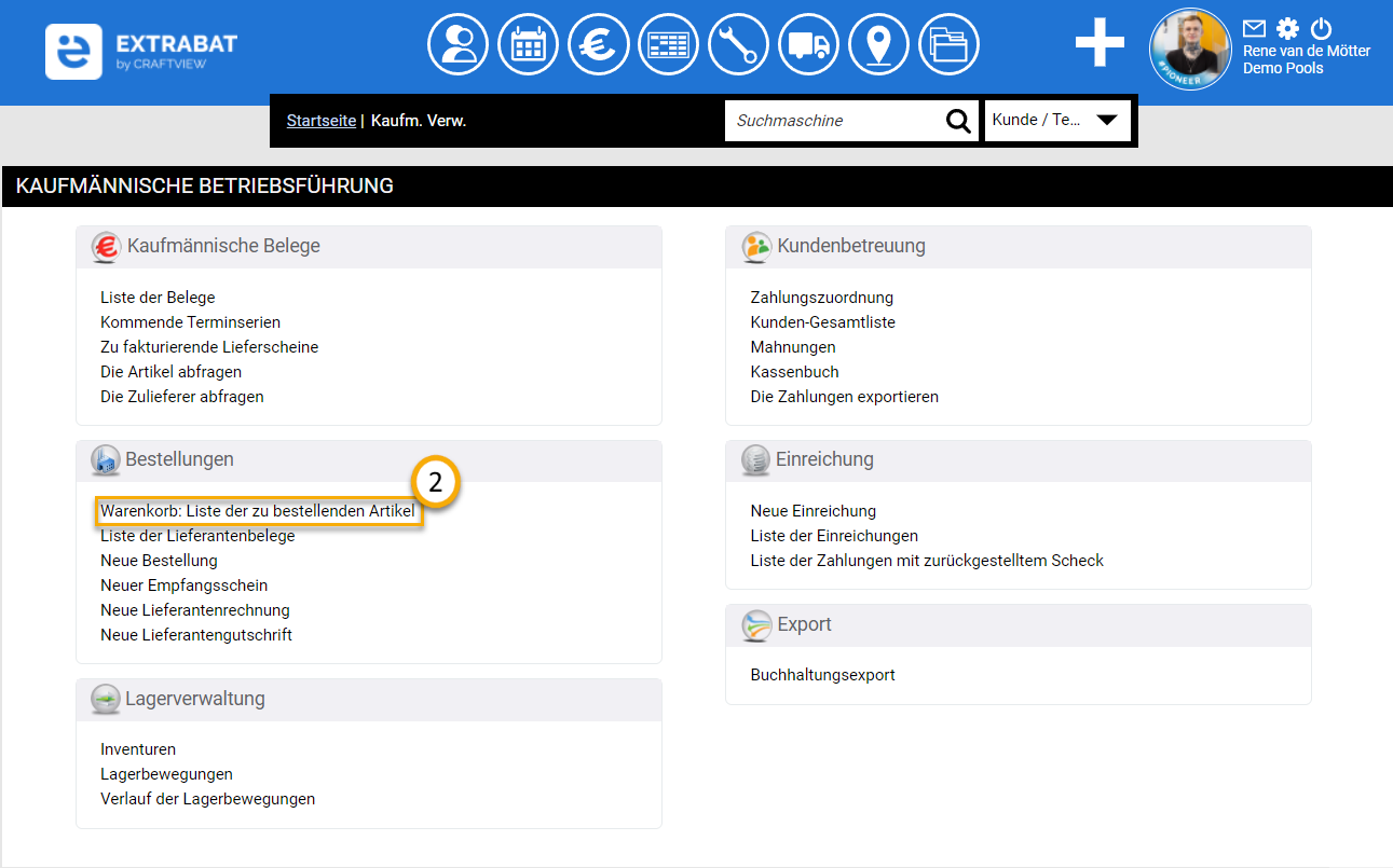 Sie können eine Bestellung für die Artikel im Warenkorb erstellen, indem Sie die Kaufmännische Verwaltung öffnen und dort den Punkt "Warenkorb: Liste der zu bestellender Artikel" aufrufen.
