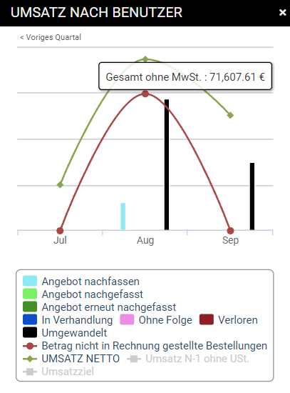 Wenn Sie mit der Maus einer der Balken/Linien auswählen, wird Ihnen der entsprechende Umsatz angezeigt.