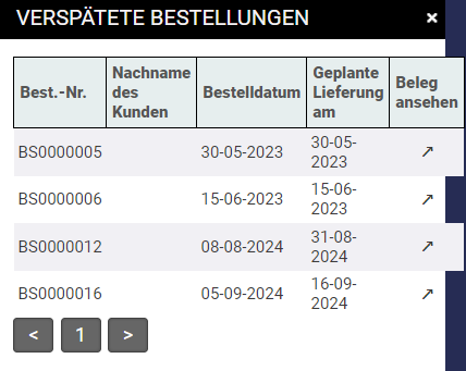 Das Widget Verspätete Bestellungen zeigt Ihnen Bestellungen an, welche das Lieferdatum überschritten haben.