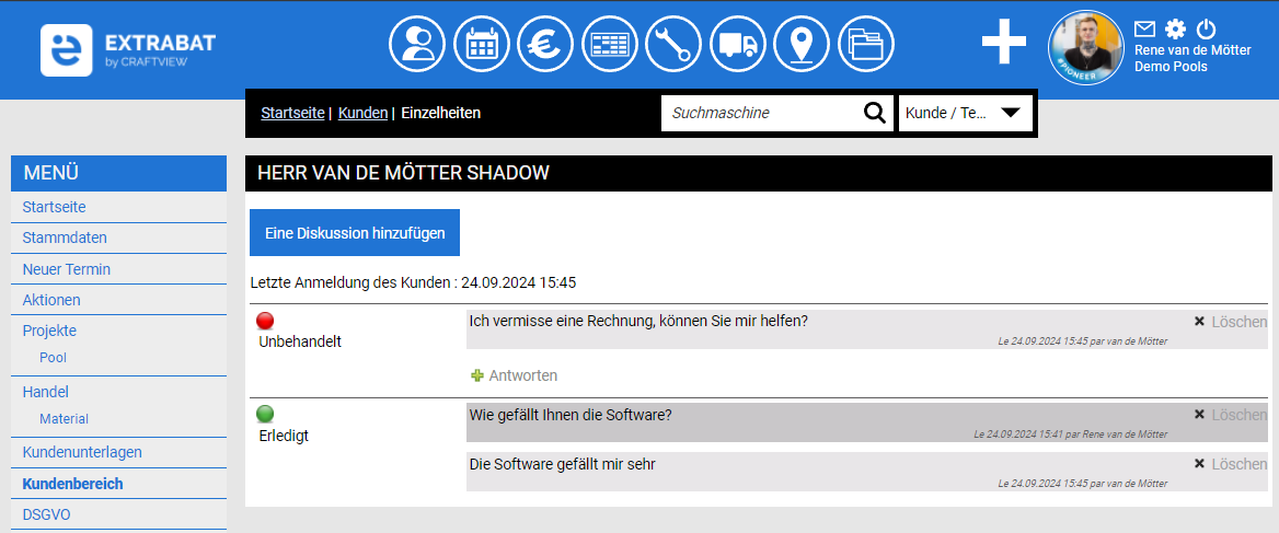 Der Kundenbereich dient zum Austausch mit dem Kunden.