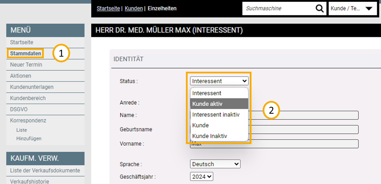 Ihre Planungsschritte können u.a. deswegen nicht in Ihre Projektplanung übertragen werden, wenn der Status Ihrer Adresse nicht (aktiver) "Kunde" entspricht. Ändern Sie den entsprechenden Status in den Stammdaten (1) ab und aktualisieren Sie Ihre Ansicht (2).